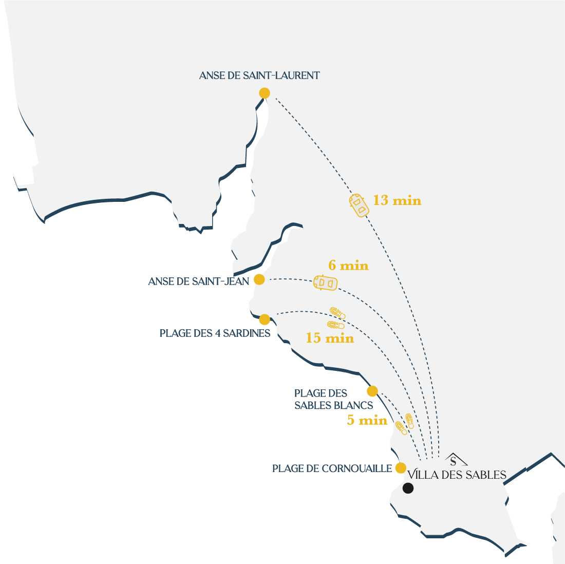 – À 15 minutes à pied / 5 minutes en voiture depuis la Villa des Sables –